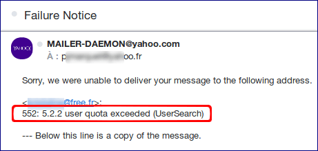 Si vous recevez un mail de réponse du serveur distant : 552 5.2 2 user quota exceeded usersearch, cela signifie