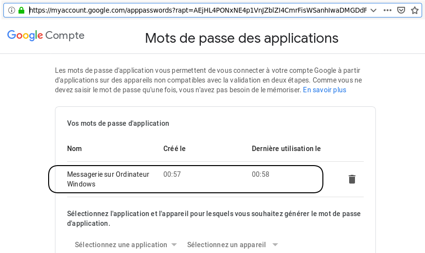AuthPass=**** (en clair) >>>> Mot de passe de l’application « sendmail » à ajouter dans notre compte Google : https://myaccount.google.com/apppasswords?utm_source=google-account&utm_medium=web