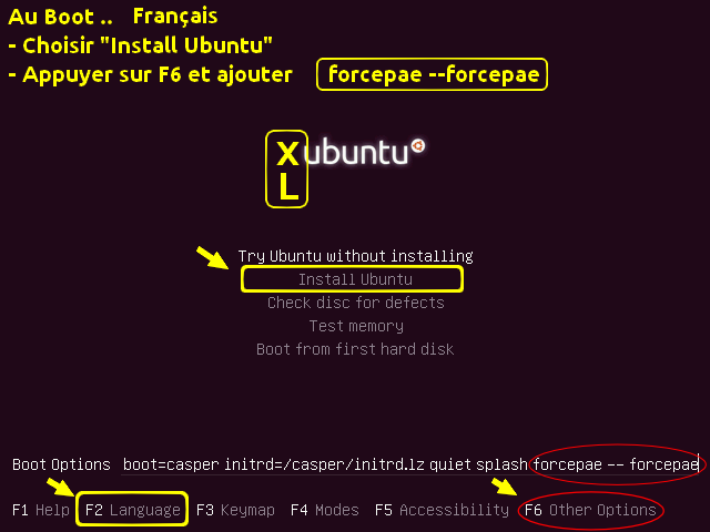PS : Avec Mint 17.3 XFCE, forcepae est au menu du boot (sinon la touche pour insérer forcepae est TAB) !