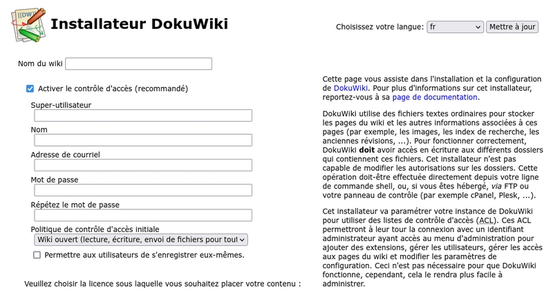 Accès : http://localhost/dokuwiki Administration : localhost/install.php?l=fr (voir écran ci-dessous) - une fois installé, supprimer (ou renommer) le fichier install.php Ecran Admin : localhost/doku.php?id=wiki:welcome&do=login