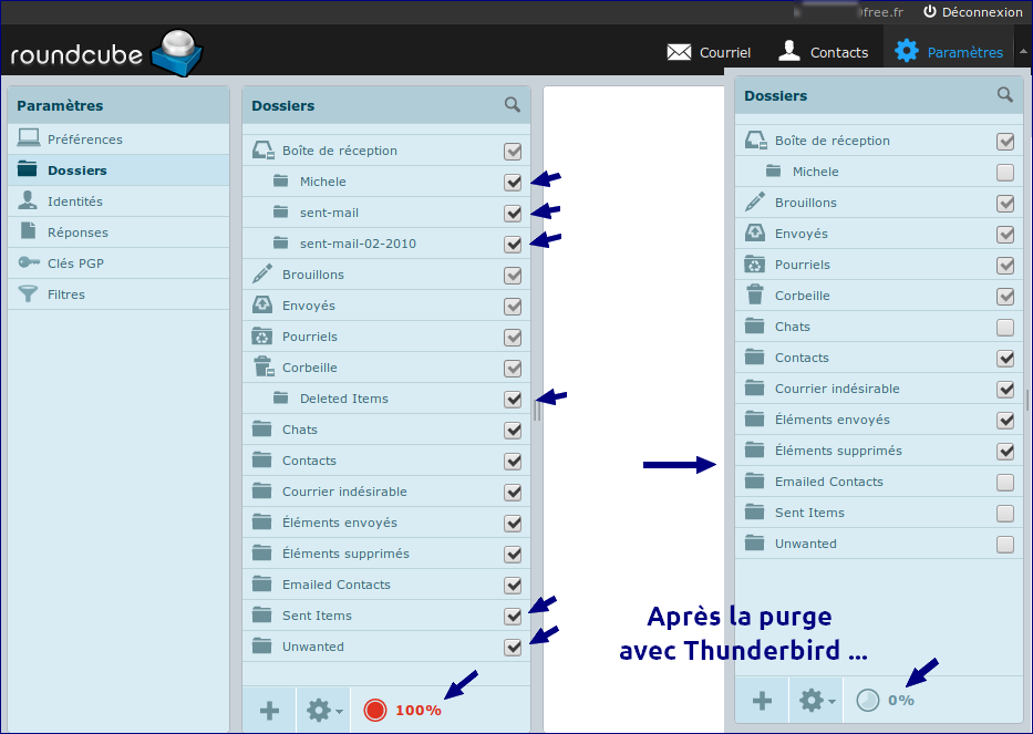 3) Se reconnecter à ROUNDCUBE pour décocher les dossiers inutilisés