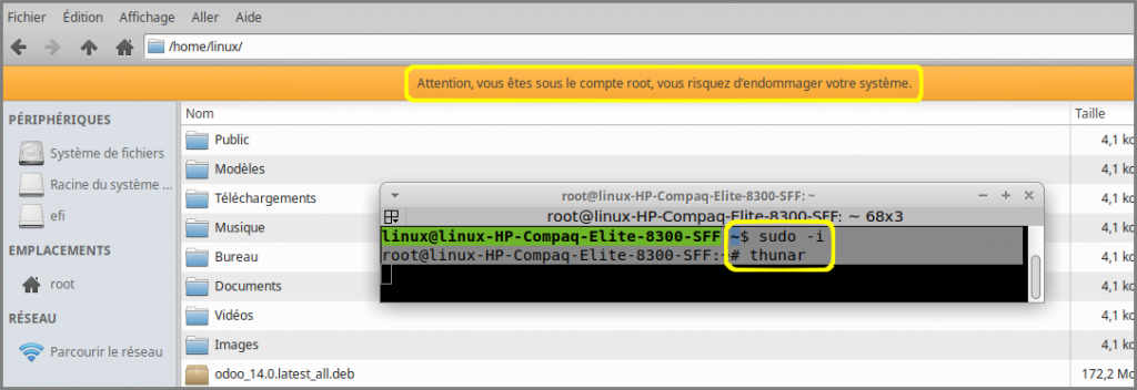 Ouvrir le gestionnaire de fichiers Thunar en mode Super UserPar PJM / 26 décembre 2021 Exemple : pour nettoyer un dossier pollué par une mauvaise manip en mode sudo dans le Terminal (sudo wget -.. site-web) $ sudo -i# thunar Partager avec Facebook Twitter Linkedin Whatsapp Email Messenger Print