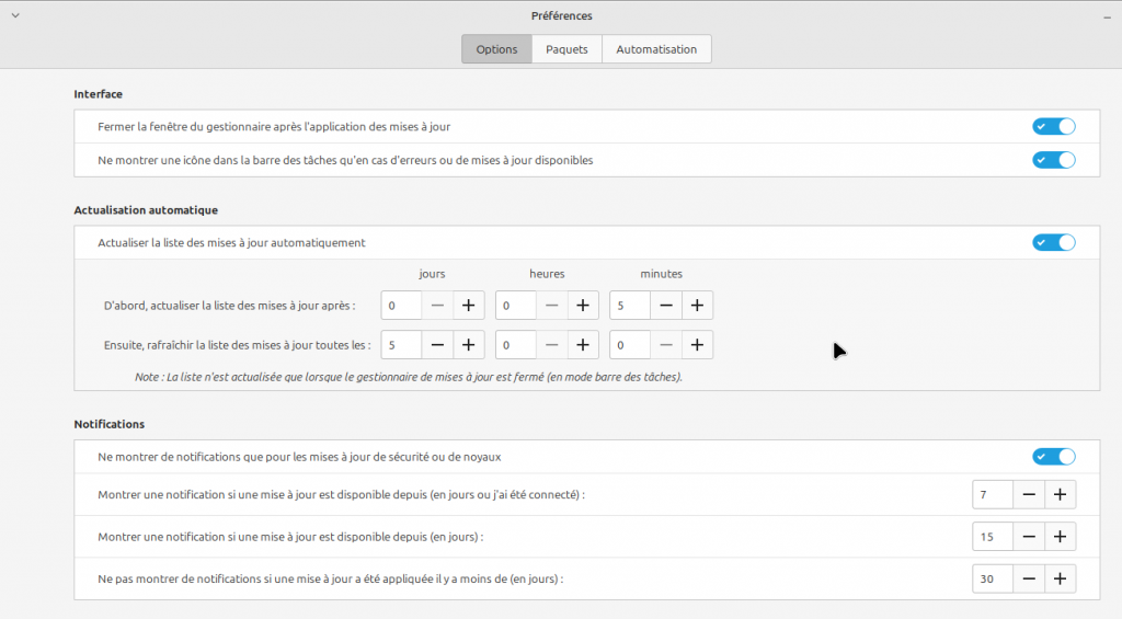 - Cocher les options pour mettre à jour automatiquement les paquets