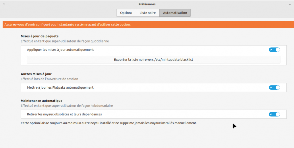 Le Programme de Linux Mint qui permet d’automatiser les mises à jour avec l’en-tête « Préférences » :