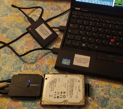 - brancher le disque sur cable USB externe (boitier HD ou cable SATA-USB alimenté)