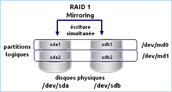 avec leurs partitions respectives : /dev/sda1 et /dev/sda2, /dev/sdb1 et /dev/sdb2.