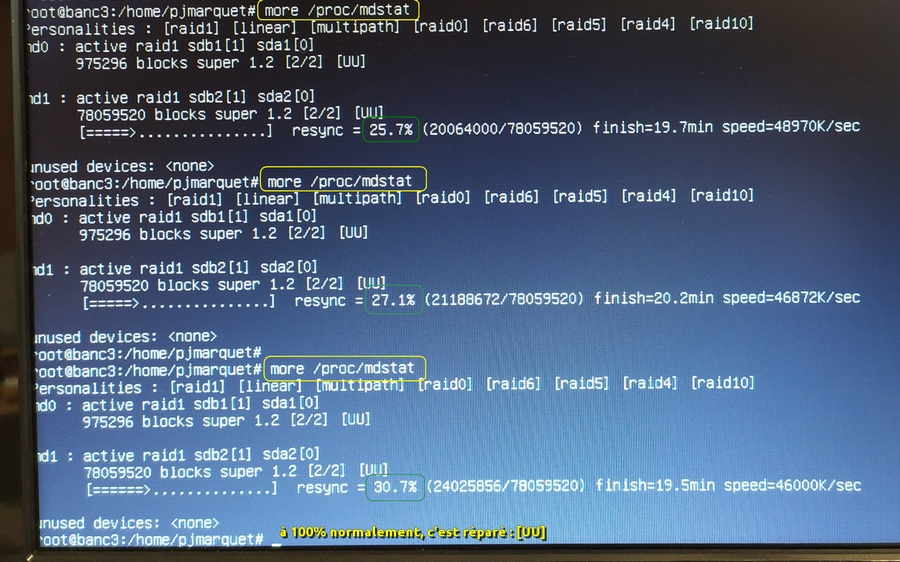 Tant que la resync n’est pas à 100% [UU] erreur résolue par le RAID ? : # more /proc/mdstat