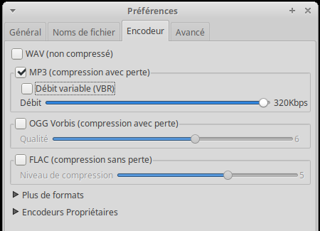 - Onglet « Encodeur » > Cocher « .mp3 » et choisir la qualité maxi : 320 Kbps en débit fixe (décocher variable)