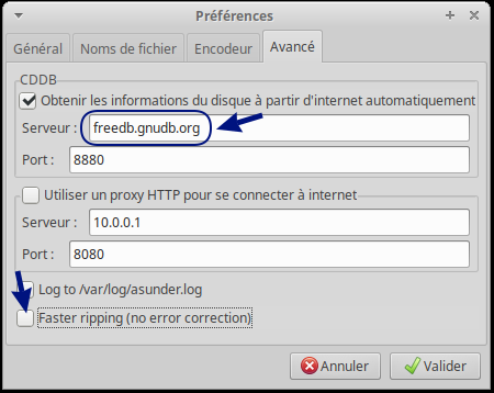 - Onglet « Avancés » > CDDB Serveur= gnudb.gnudb.org permet d’affecter le titre de l’album et des chansons !!!