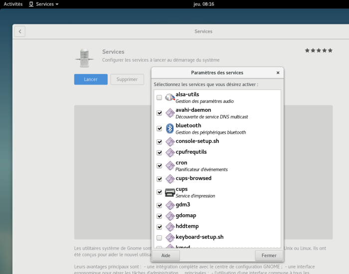 Services en mode interface GNOMEPar PJM / 7 mars 2019 Pour activer et désactiver facilement les services : utiliser le programme service de GNOME Partager avec Facebook Twitter Linkedin Whatsapp Email Messenger Print