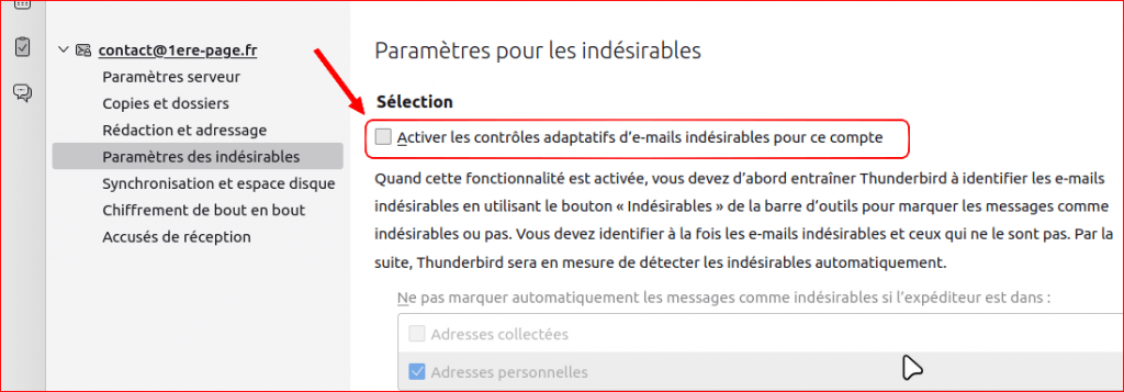Thunderbird : attention au contrôle adaptatifPar PJM / 19 mai 2024 Ce contrôle adaptatif m’a mis de nombreux emails à la corbeille … avant que je réussisse à déterminer le paramétrage qui était responsable de cette « mise à la poubelle » !!! Je propose de désactiver ce contrôle : Partager avec Facebook Twitter Linkedin Whatsapp Email Messenger Print