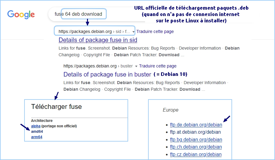 • Recherche [nom-du-prog-ou paquet] + 64 (architecture) + deb + download